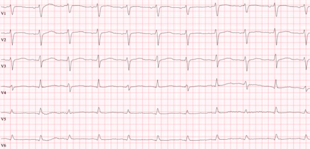 On this ECG the only evident abnormality (apart from the AF) is the down-slopping ST segments seen in leads V4-V6, I and aVL. These down-slopping ST-segments (or reverse ticks) are characteristic of digoxin treatment. It can be difficult to distinguish this appearance from ST depression associated with an NSTEMI. In NSTEMI the ST depression is horizontal (not down-slopping). Digoxin is often used in the treatment of atrial fibrillation (especially if there’s co-existing heart failure) in the elderly population
