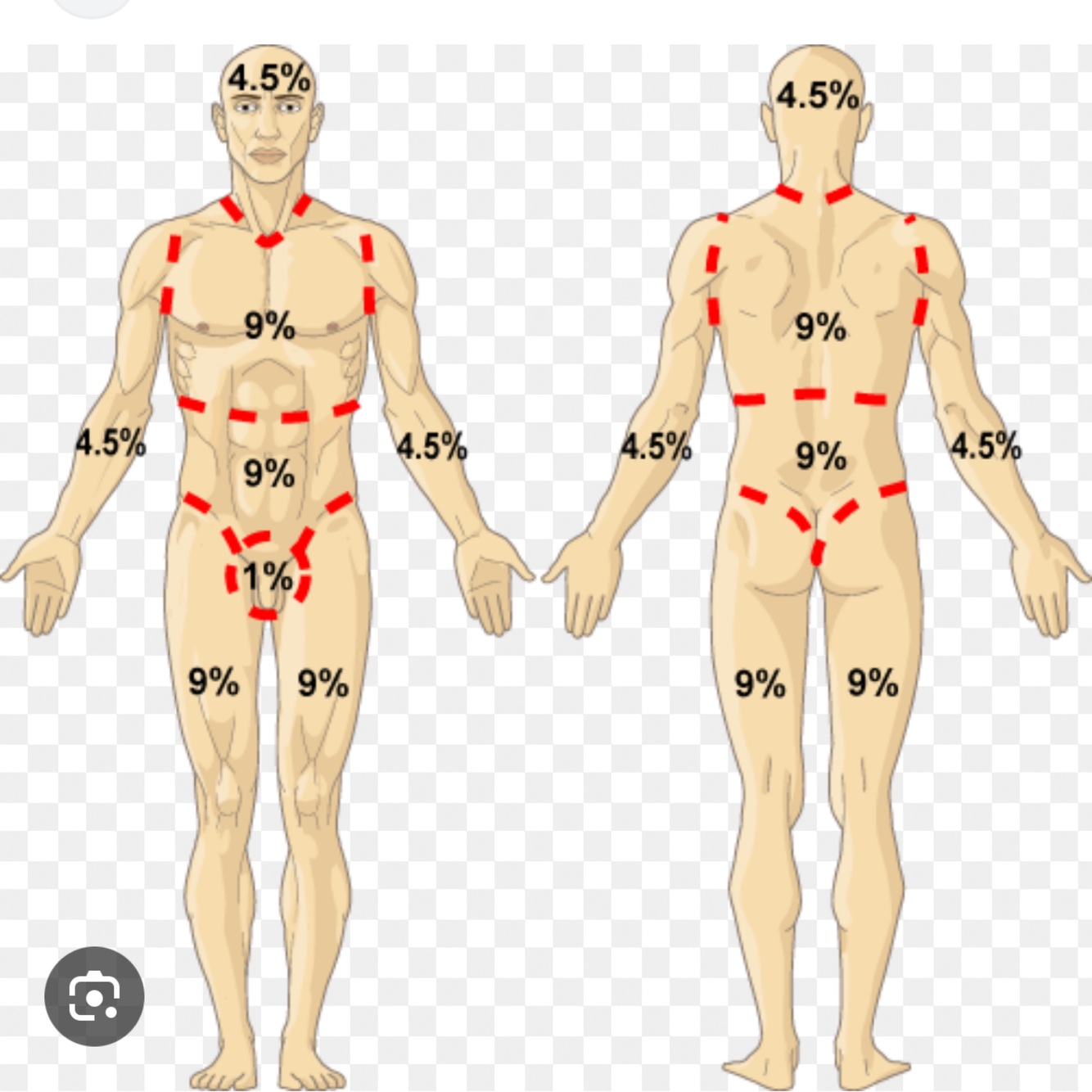 Using the rule of nines, each anterior arm is 4.5%, and the upper anterior chest is 9% (4.5 + 4.5 + 9 = 18%).