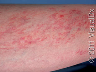 small, red punctate macules in serpiginous pattern, esp over extremity