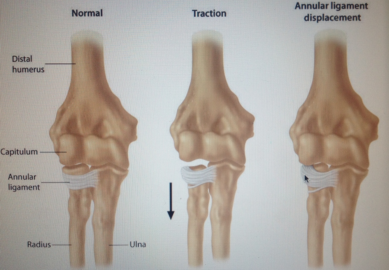 occurs when there is a sharp pull on the hand while the forearm is pronated and the elbow extended, which causes the annular ligament to slip over the head of the radius and slide into the radiohumeral joint, where it becomes trapped