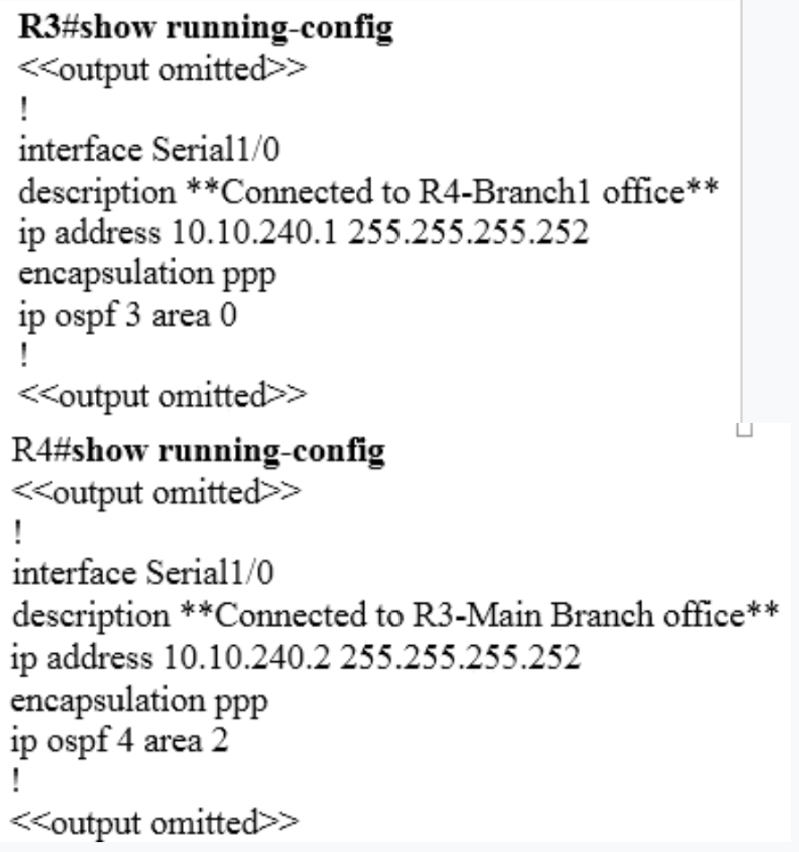 An OSPF neighbor adjacency is not formed between R3 in the main office and R4 in the Branch1 office. What is causing the problem?