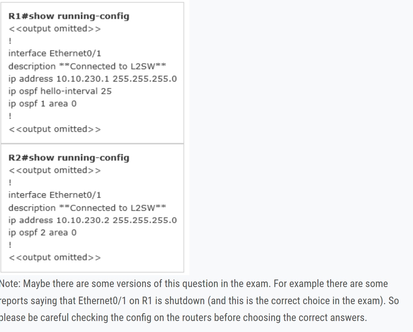 The only difference we can see here is the line “ip ospf hello-interval 50″ on R3. This command sets the number of seconds R3 waits before sending the next hello packet out this interface. In this case after configuring this command, R3 will send hello packets to R5 every 50 seconds. But the default value of hello-interval is