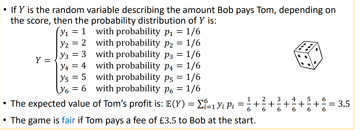 Tom and Bob play a game with a single fair die. Bob pays Tom an amount (in £) equal to the score of the die. In return, Tom pays Bob a fee (in £) at the start of the game. How much should the fee be so that the game is fair?