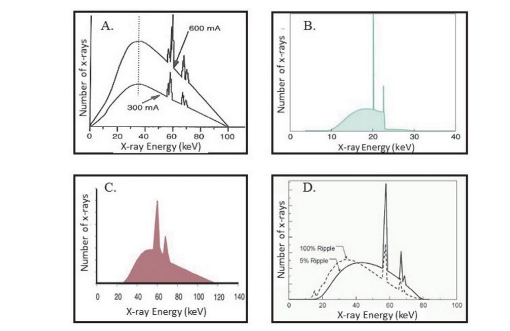 The energy spectra shown in Graph A would be for a tube voltage setting of 100 kV and tube current settings of 300 and 600 mA. Graph A is a better choice than Graph D because posterior-anterior (P-A) chest radiographs are typically obtained with a higher tube voltage (kV) and current (mA) to yield a greater x-ray intensity and, consequently, a shorter exposure time. The spectrum in Graph D corresponds to a relatively low tube voltage of only 80 kV