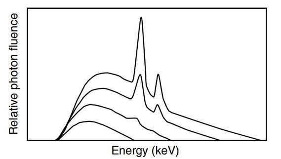 In graph below of multiple x-ray energy spectra, what x-ray tube parameter was changed in transitioning from the top spectrum to the bottom spectrum