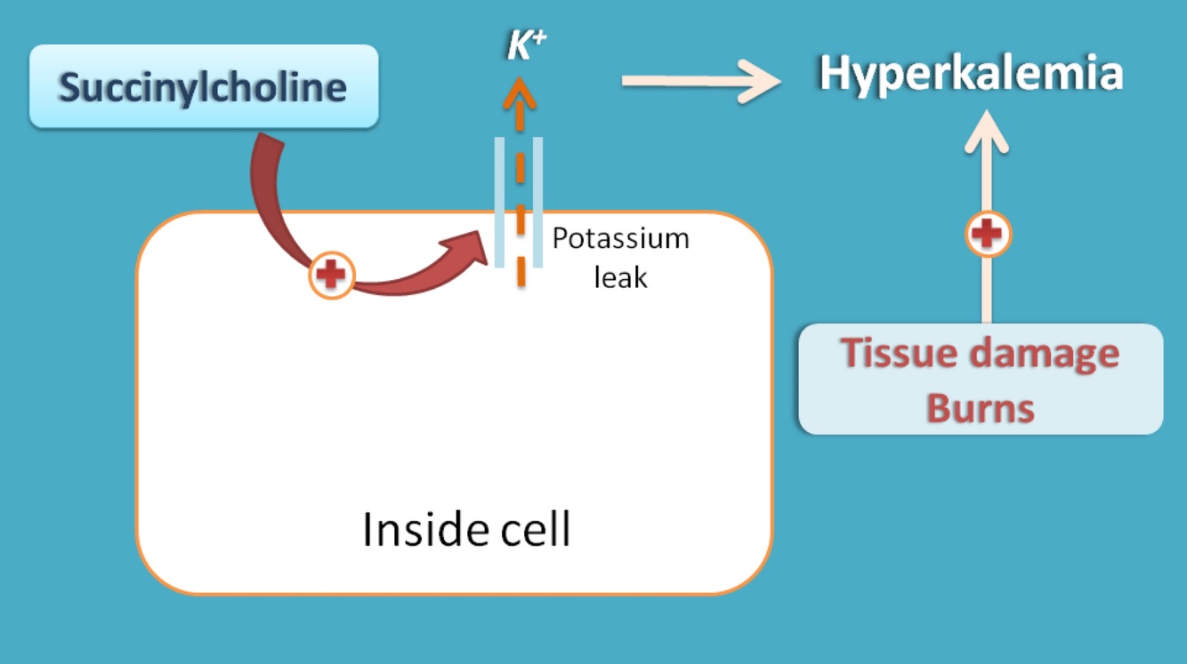Succinylcholine is a depolarizing neuromuscular junction blocker -> depolarizes -> keeps AP in refractory period -> incr K+ leaks out -> HyperK+