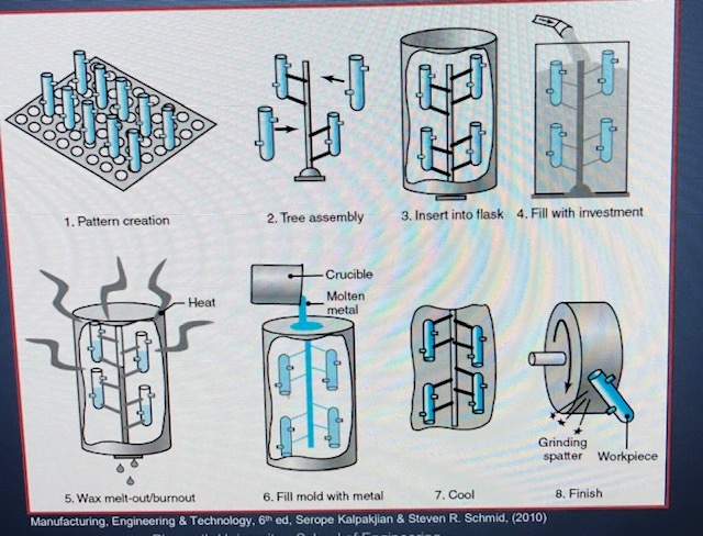 1) Pattern creation 2) Tree Assembly 3) Insert into Flask 4) Fill with investment 5) Wax melt-out/burnout 6) Fill mold with metal 7) Cool 8) Finish (Grind polish)