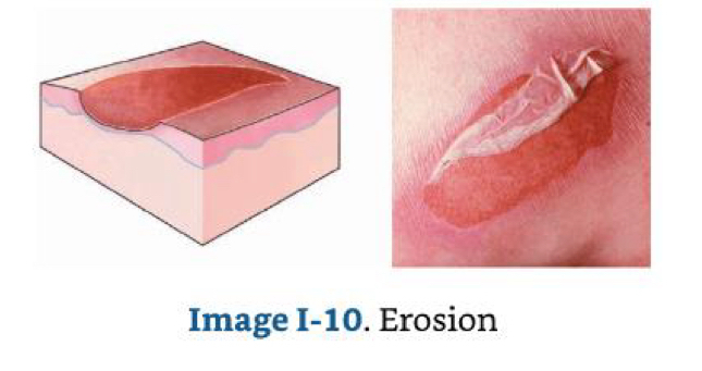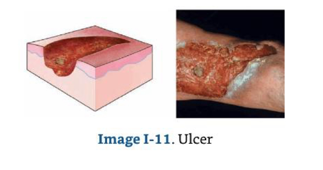 A focal loss of full-thickness epidermis and partial to fill thickness dermis, which often heals with scarring.