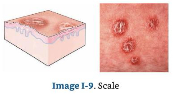 Excess dead epidermal cells; scale may be fine, silvery, greasy, desquamative, or adherent.