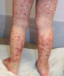 Rash (palpable purpura across buttocks and extensor surfaces)