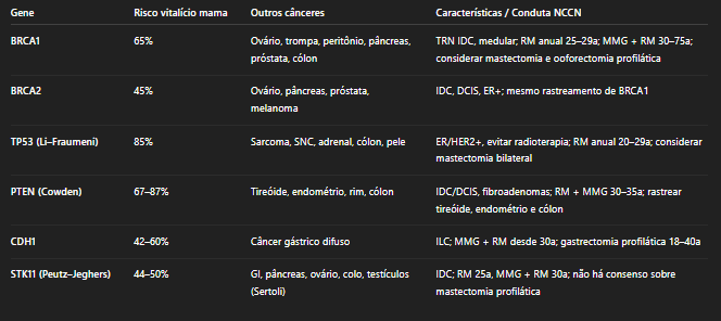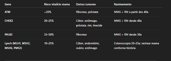 ATM / CHEK2 / PALB2: IDC/DCIS típicos; padrão esporádico.