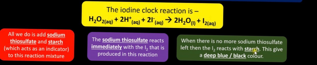 When does the starch tuen a blue-black colour in an iodine clock reaction and why?