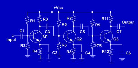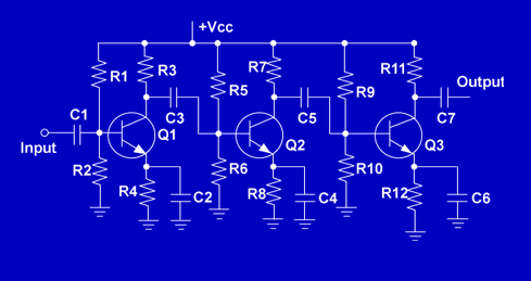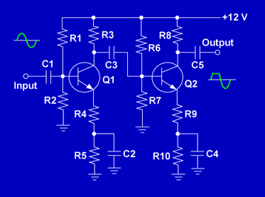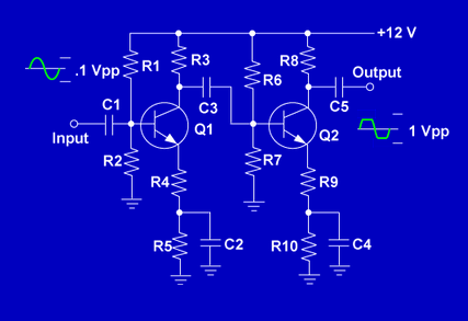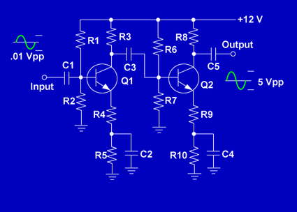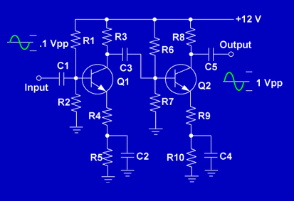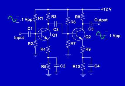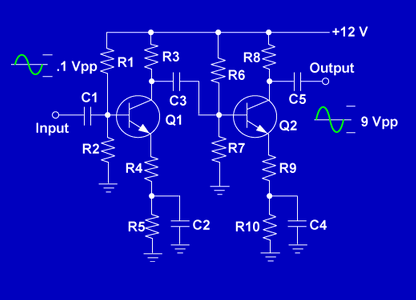 In this RC coupled amplifier, what is the product of Q1 and Q2’s voltage gains?