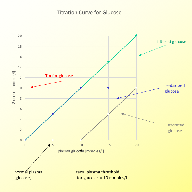 (If plasma [glucose] = 15 mmoles/l, 15 will be filtered, 10 reabsorbed and 5 excreted.)