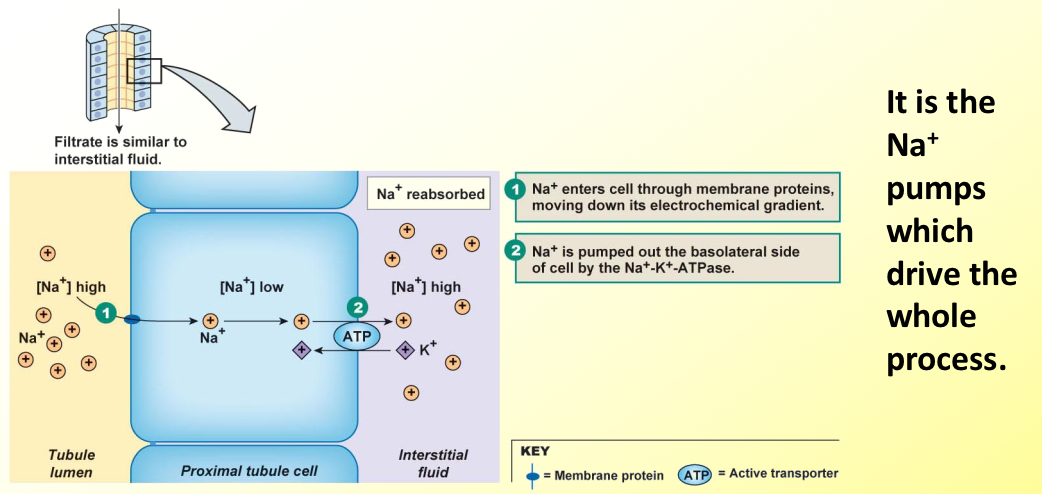Na+ reabsorption also linked to HCO3- ion reabsorption (A/B).