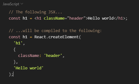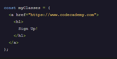 // When rendered, this JSX expression... const heading = <h1 className="large-heading">Codecademy</h1>; // ...will be rendered as this HTML <h1 class="large-heading">Codecademy</h1>