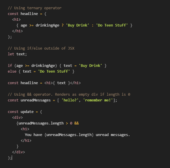 JSX does not support if/else syntax in embedded JavaScript. There are three ways to express conditionals for use with JSX elements: