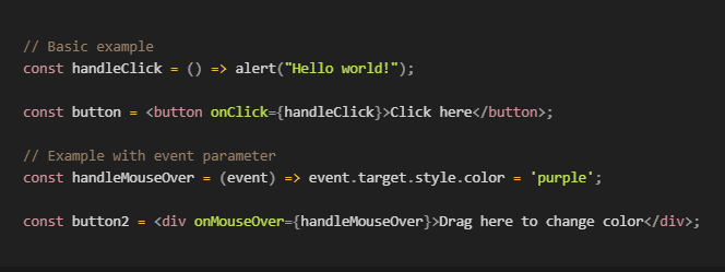 In JSX, event listeners are specified as attributes on elements. An event listener attribute’s name should be written in camelCase, such as onClick for an onclick event, and onMouseOver for an onmouseover event.
