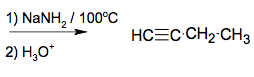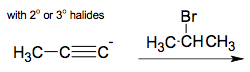 Because of the bulky halide group, reaction proceeds via the E2 mechanism. Results in the formation of a double bond after hydrogen is taken from acetylide ion and bromine leaves.