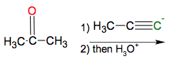 Use of the acetylide ion with a carbonyl group proceeds by what mechanism and yields what result?