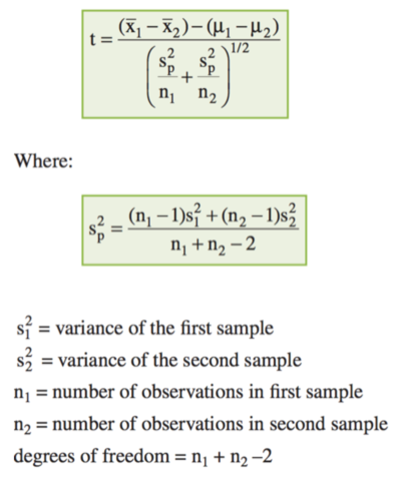 In tests where it is assumed that the variances of the two populations are equal, we use the pooled variance (s2p) in the calculation of the t‐stat. The test statistic, the pooled variance, and the degrees of freedom for the t‐test are calculated as follows: