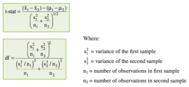 In hypothesis tests where it is assumed that the variances of the two populations are unequal, the test statistic and the degrees of freedom for the t‐test are calculated as follows: