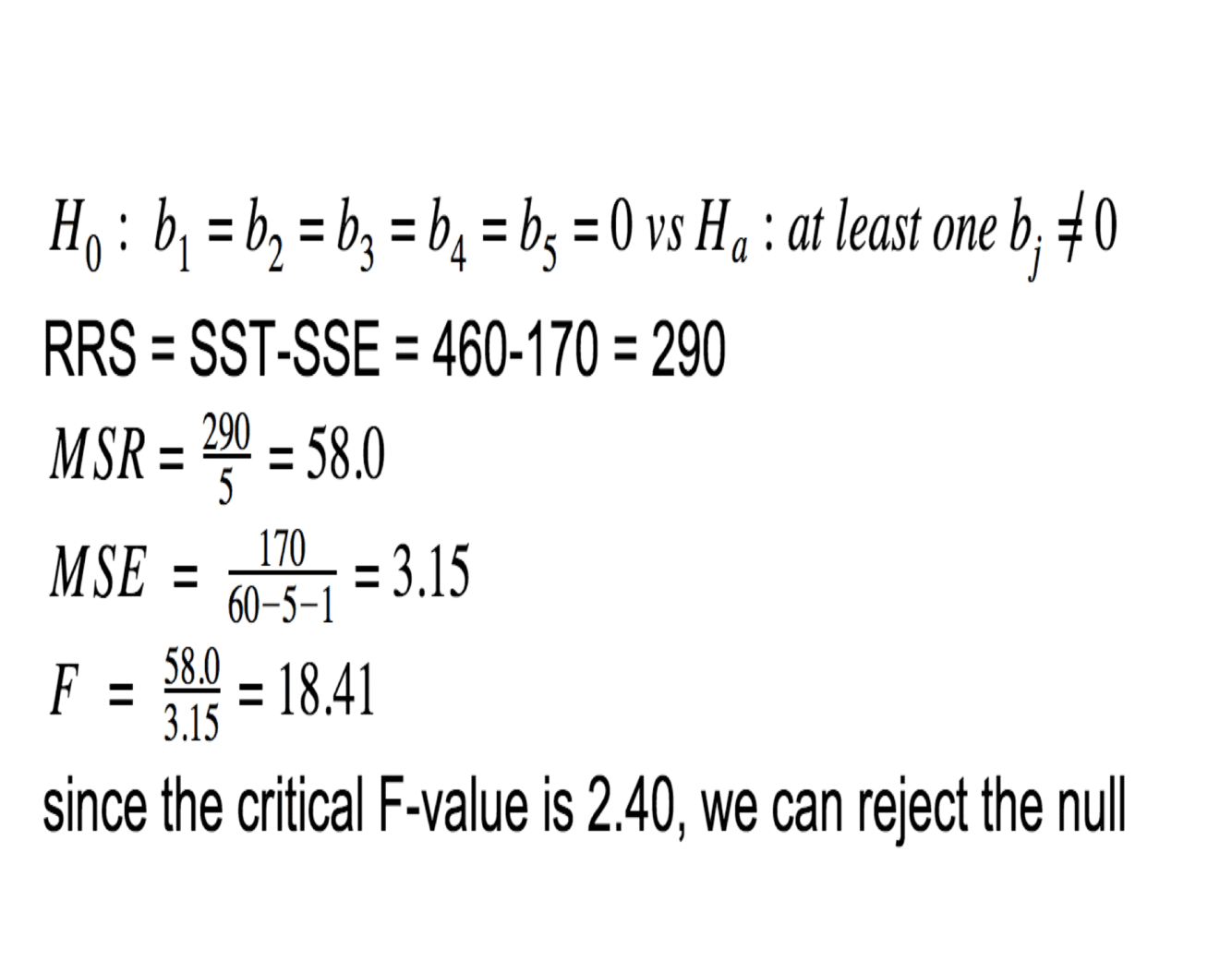 Test the null hypothesis at the 5% significance level that all five of the independent variables are equal to zero.