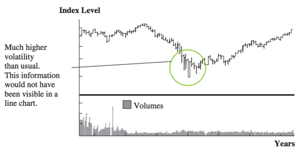 While a line chart has one data point for each value of the horizontal axis (time), a bar chart presents four pieces of information—opening price, highest and lowest prices, and the closing price for each time interval (see Figure 2-2). Bar charts enable an analyst to get a better sense of the nature of trading during the period. A short bar indicates low price volatility, while a longer bar indicates high price volatility.
