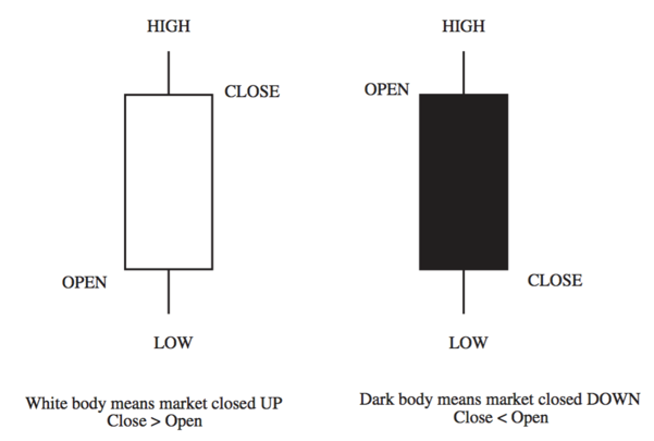 A candlestick chart provides the same information as a bar chart (i.e., opening and closing prices, and highs and lows during the period). Further, it also clearly illustrates whether the market closed up or down. The body of the candle is shaded if the closing price was lower than the opening price, and the body is clear if the closing price was higher than the opening price. (See Figures 2-4 and 2-5.)