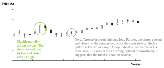 No difference between high and low. Further, the shares opened and closed at the same price; hence the cross pattern. Such a pattern is known as a doji. A doji indicates that the market is in balance. If it occurs after a strong uptrend or downtrend, it suggests that the trend is about to reverse.