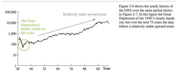 The vertical axis on any of the charts that we have already discussed can be constructed with a linear (arithmetic) scale or a logarithmic scale. A linear scale is more appropriate when the data fluctuate within a narrow range (see Figure 2-7). In a logarithmic scale, percentage changes are plotted on the vertical axis. They are more appropriate when the range of data is larger (see Figure 2-8). Time is plotted on the horizontal axis. The length of the time period depends on the underlying data and the purpose of the chart. Active traders typically prefer shorter time intervals.