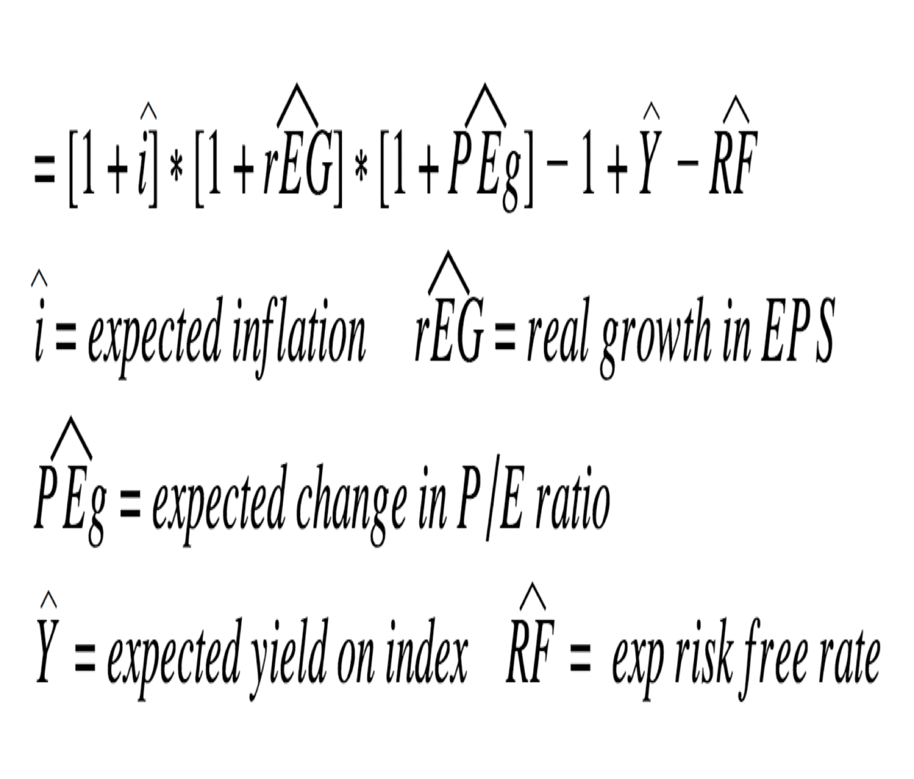 = (1 yr forecasted dividend yield on market index) + (consensus long term earnings growth rate) - (long term government bond yield)