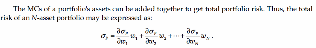 The MCs (marginal contribution) of a portfolio’s assets can be added together to get total portfolio risk. Thus, the total risk of an N-asset portfolio may be expressed as: