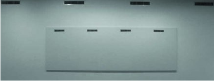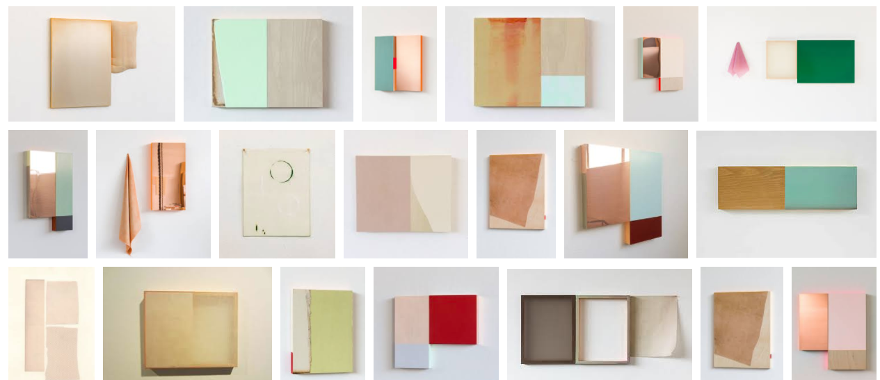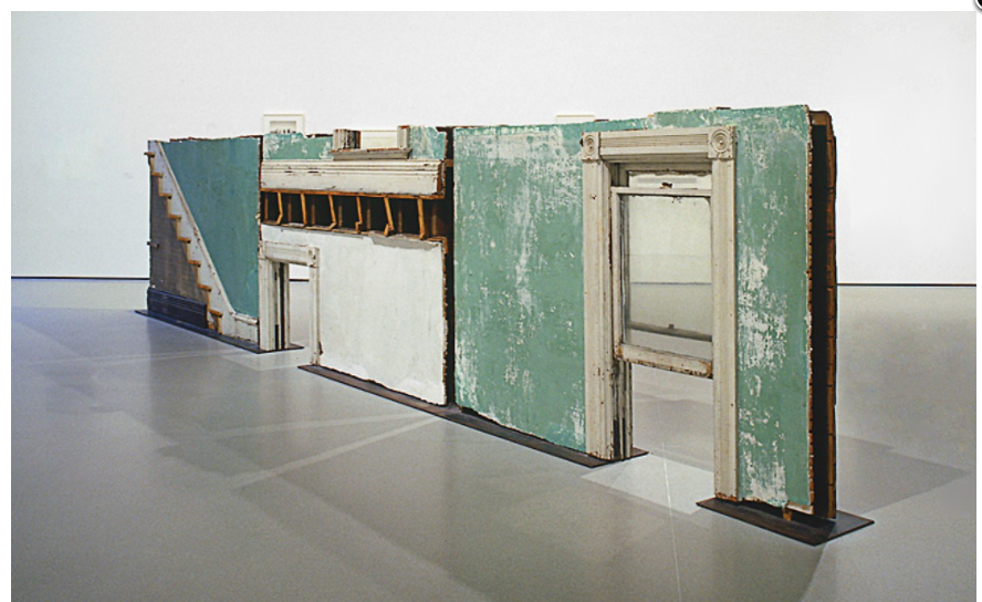 Three building fragments: painted wood, metal, plaster and glass.