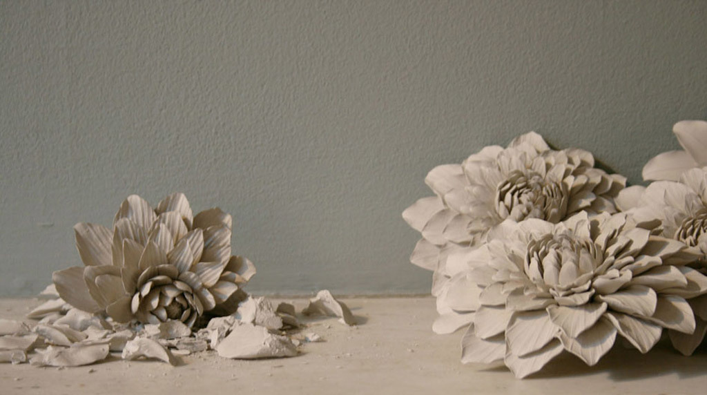 unfired ceramic flowers; crumble as the viewers touch
