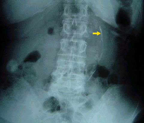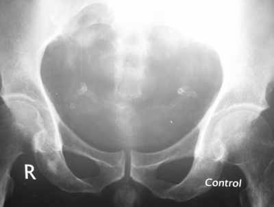 This patient manifests two tracklike calcifications symmetrically on each side of the bladder that end in the urethra – the vas deferens! This occurs much more commonly and earlier in diabetics than as a natural degenerative process.