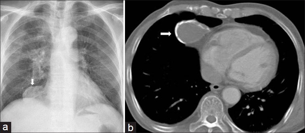 This is a calcified pericardial cyst. A rimlike calcification is seen in the right cardiophrenic angle, an ideal location for pericardial cysts. These are usually asymptomatic and discovered when a CXR is obtained for another reason.