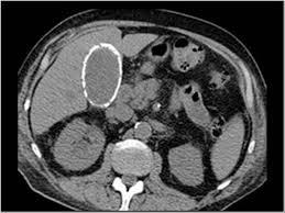 Porcelain gallbladder –rimlike calcification in RUQ. This condition occurs with chornic inflammation and stasis and is associated with both gallstones and an increased incidence of gallbladder CA.
