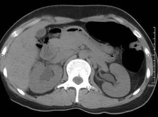 Mild enlargement of the right kidney, perinephric fat stranding on the right (sign of inflammation; arrowheads) and dilated right renal pelvis. Patient had ureteric stone.