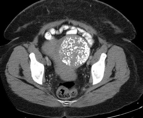 Calcified uterine leiomyoma –amorphous calcification visible in the pelvis. This type of calcification suggests formation in a solid organ or tumor.