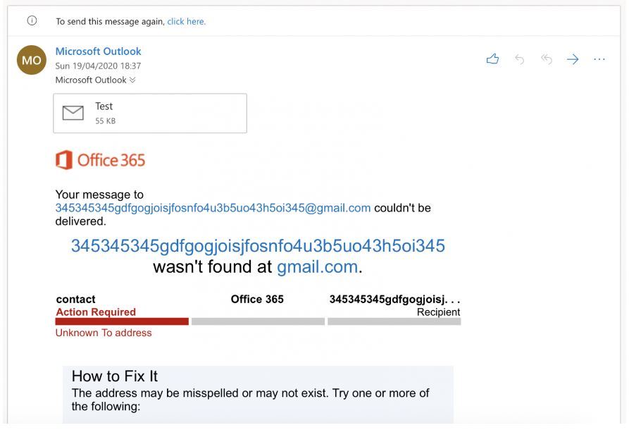 Below is an example of an “undeliverable” message that is displayed when sending emails from Outlook. In this case, we have attempted to send a blank message to a Gmail mailbox that isn’t in use.