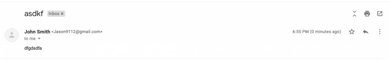 In our first example, a Gmail mailbox with the name John Smith but the mailbox name Jason9112@gmail.com has sent a message with a random subject line “asdkf” and body content. This is clearly not a legitimate email and is using the spam recon method to identify if the recipient is a real mailbox or not. The sender is not attempting to retrieve a human response to this email, as there is no question or action to be completed by the recipient. The attacker is simply looking if an “undeliverable” message is generated or not.