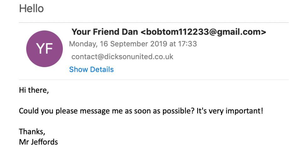 In this email, the sender bobtom112233@gmail.com is sending a recon email to contact@dicksonunited.co.uk with the subject line “Hello”. As you can see in the body content, the message is extremely vague and isn’t targeted at anyone, using the generic “hi there” opening line. It is also unexpected that a legitimate email from “your friend Dan” would be going to a group mailbox such as “contact@domain”.