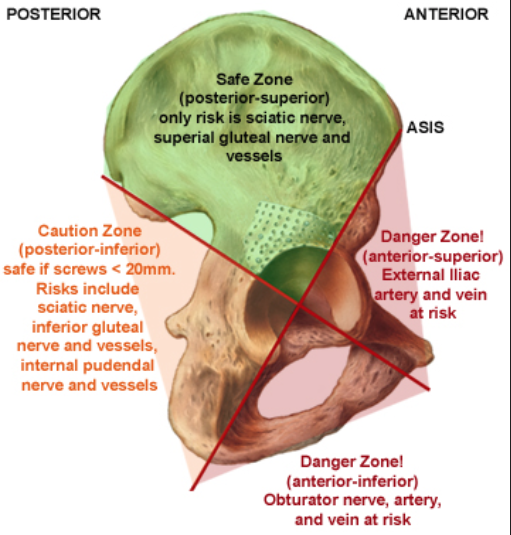 What are the four quadrants and their dangers for screw placement for acetabular cups?