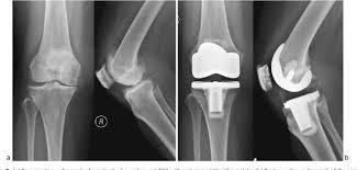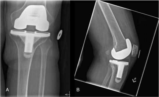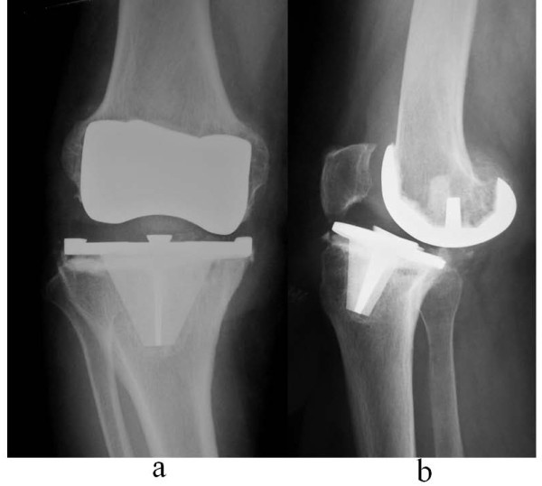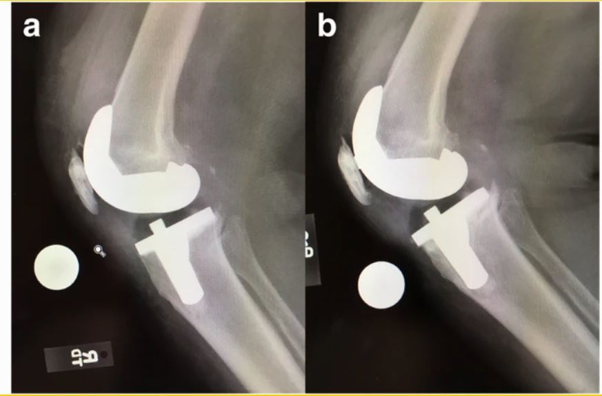 The classic loosening of the implant in worst instances begins with a delamination pull-away of the cement on the posterior keel, followed by failure of the proximal posterior tibial surfaces; Compare the positioning immediately post-op (a) verses that at 6 months, where the slope changes from 7o to 9o and the implant subsides (b)