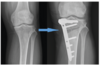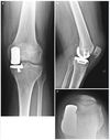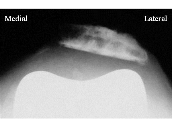 This patient has undergone single knee TKA. Post operatively, she experience pain in her knees. Plain radiograph is done and is shown.