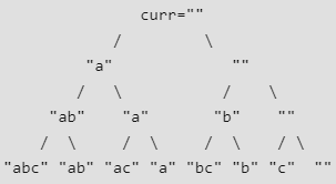 Output : “”. “a”, “b”, “c”, “ab”, “ac”, “bc”, “abc”