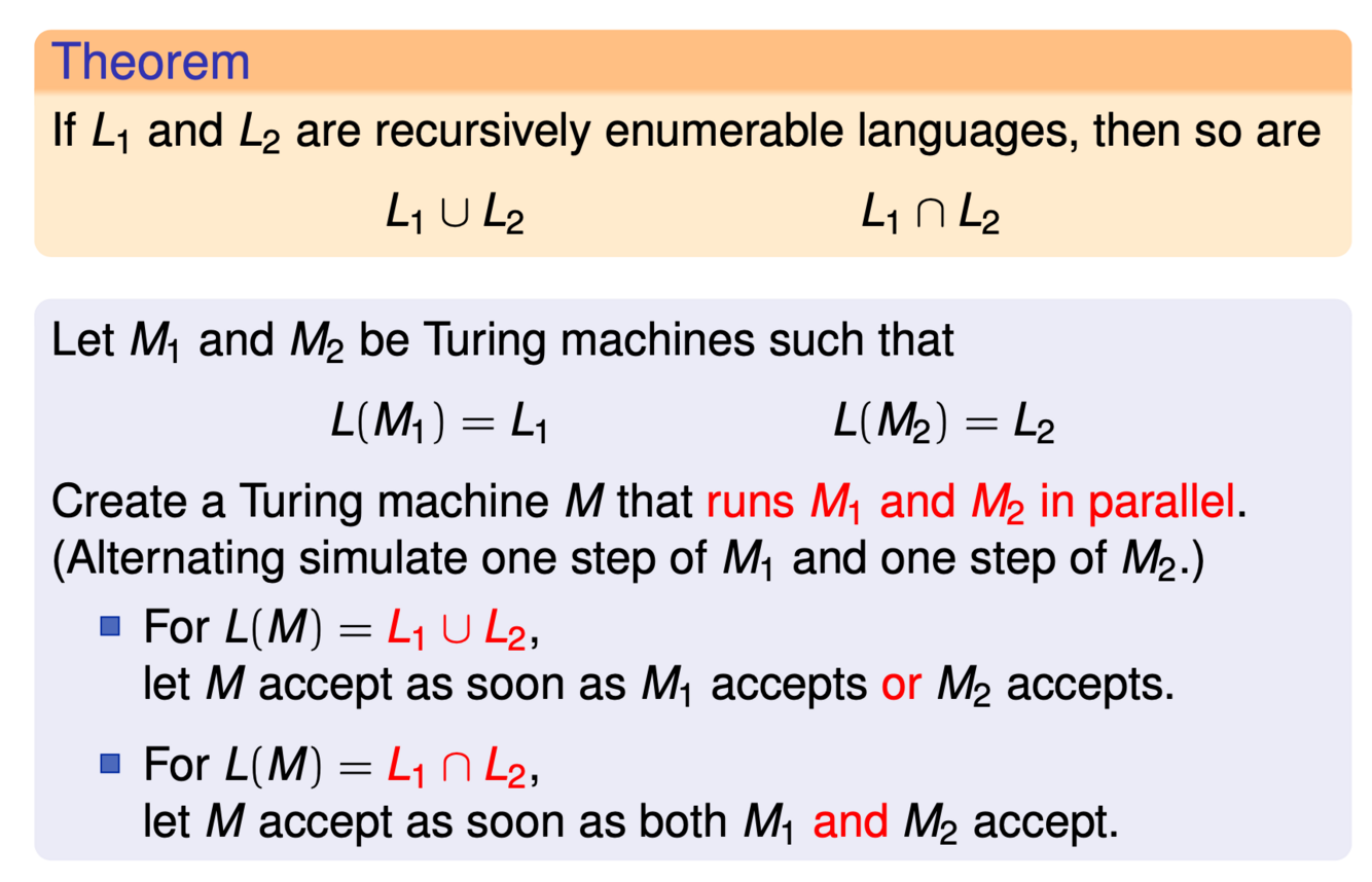 How do the Union and Intersection work with recursivelu enumerable languages?