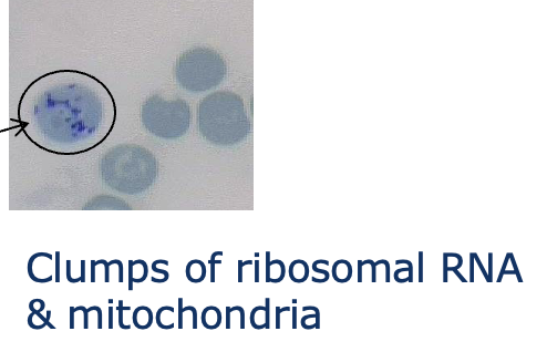 New methylene blue (NMB) stain: highlights reticulocytes by precipitating ribosomal RNA and mitochondria as a visible network.