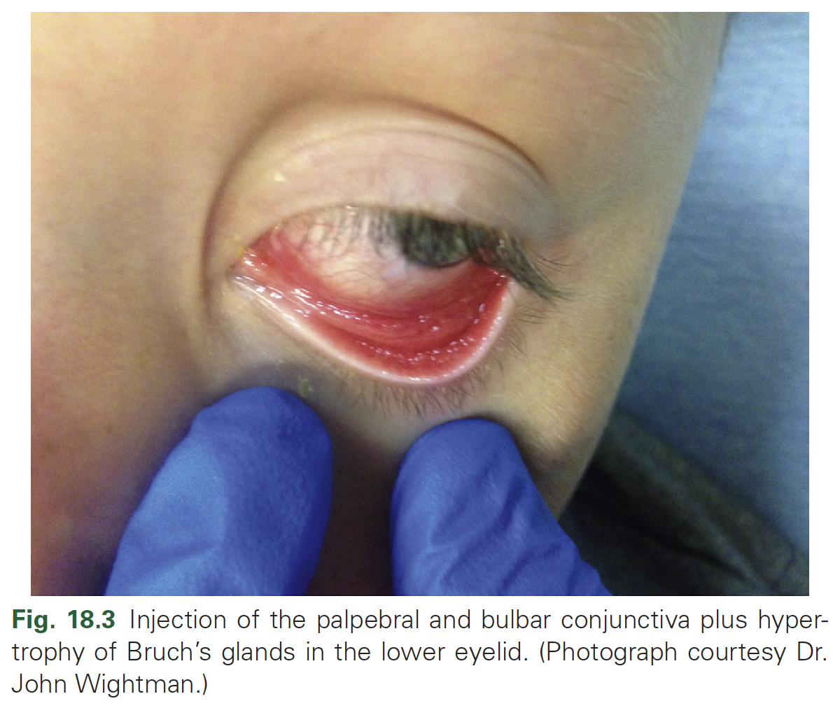Punctate “follicles” are hypertrophy of lymphoid tissue in Brunch glands along the conjunctival surface of one or both lower lids. Relatively specific for viral etiology